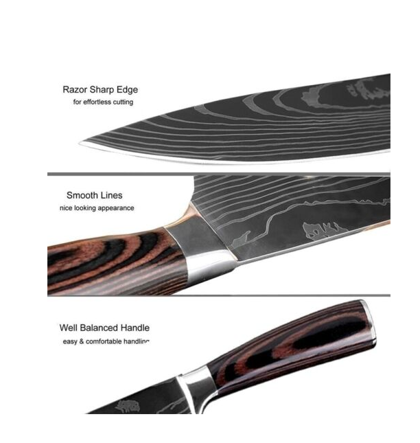 Tips: The blade is 7CR17 stainless steel, the surface of the laser Damascus pattern, very beautiful, good workmanship, razor sharp, keep your kitchen away from the blunt knife, and enjoy your kitchen life!