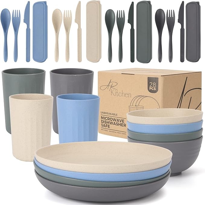 AR Kitchen Wheat Straw Dinnerware Set - 28-Pcs Unbreakable Dinnerware Set with Plates, Bowls, Cutlery, Drinking Cups - Eco-Friendly Natural Wheat Straw - Non-BPA Food-Grade Microwave-Safe Dinnerware