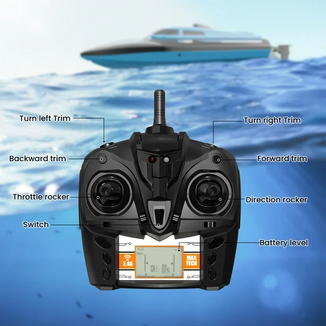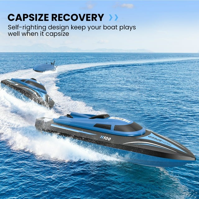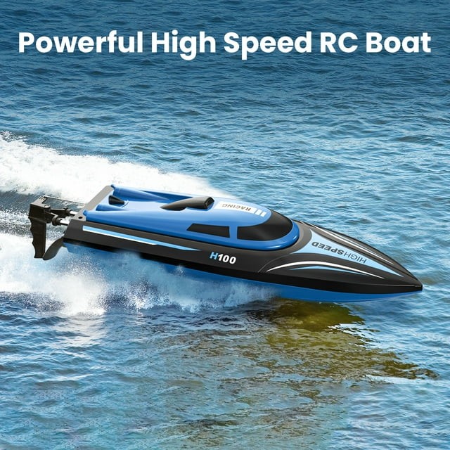 • High-speed Remote Control Boat:  H100 RC boat for adults and kids races across the water at up to 20 mph. This high-speed boat submarine toy is equipped with a 4-channel 2.4 GHz remote with a 150-meter signal range.