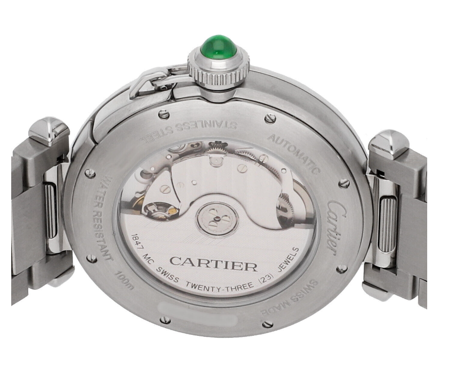 Pre-Owned Cartier Pasha (WSPA0022) self - winding automatic watch, features a 41mm stainless steel case surrounding a green "arabic" dial on a stainless steel bracelet with folding buckle. Functions include hours, minutes, seconds and date. This watch comes complete with the original box and papers. Time remaining on the factory warranty!