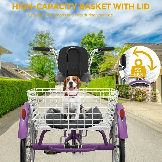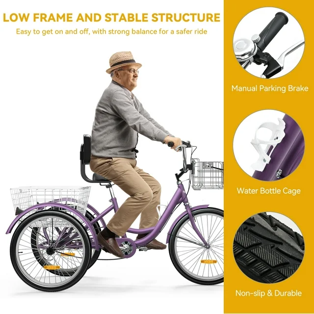 Dextrus Adult Tricycle, 24 Inch 3 Wheel Bikes, 1 Speed Trike Bike for Adults with Removable Baskets, Cruiser Bike for Seniors Women Men Shopping Picnic Outdoor Sports, Purple
