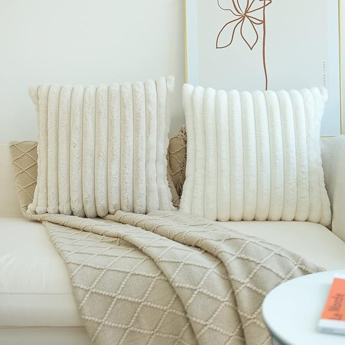 JOJUSIS Pack of 2 Faux Fur Plush Decorative Throw Pillow Covers Striped Couch Cushion Case Soft Fluffy Pillowcases(Beige, 18 x 18-Inch)
