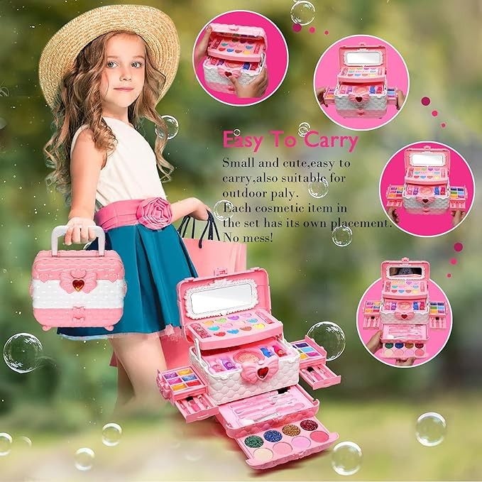 • ?【Safe & Non-Toxic Washable Makeup Toys for Girls】 Kids makeup kit for girl is non-toxic, safe and washable.Kids makeup kit toys for girls have passed the American toy safety test.The size of the kids makeup kit for girl is also designed according to the size suitable for little girls. The makeup toy set for girl are made of safe, water-soluble materials that can be washed off with soap and water, mild material, no preservatives, no burden on the child's skin,please rest assured to use them.