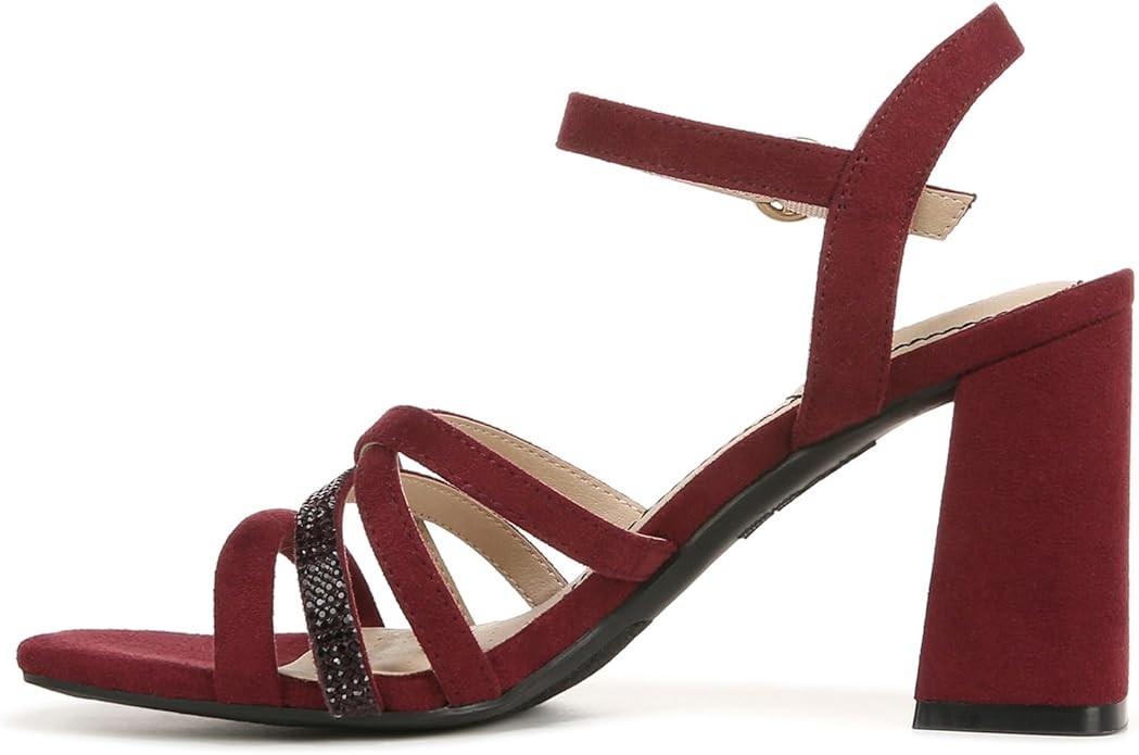 Womens high heel dress shoes feature a microfiber upper with an open square toe, ankle strap with adjustable buckle closure, sparkle accents, built-in stretch, and tapered block heel