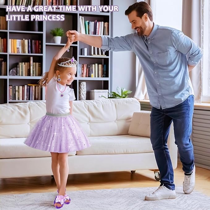 • Princess Dress Up Play Shoes: The elastic waistband princess skirt has a polyester lining and an outer layer of tulle which is covered by snowflakes, stars, moon patterned glitters. 3 pairs of wide non-slip princess dress-up shoes for girls features bowknot decor in different colors. It is fixed on the shoe by sewing, compared to sticking, making it more secure and comfortable