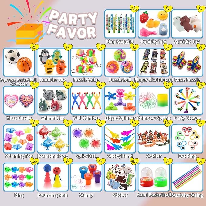 • ?【Multiple Varieties of Party Favor】?27 types 180pcs of cool party favor for kids goodie bags, including Slap Bracelets, Mochi Squishies, Sticky Hands, Finger Skateboards, Tumbler Toys, Maze Puzzles, Rainbow Springs, Fidget Spinners, Mini Stress Balls, and more. These goodie bag toys will be very popular at the birthday party!