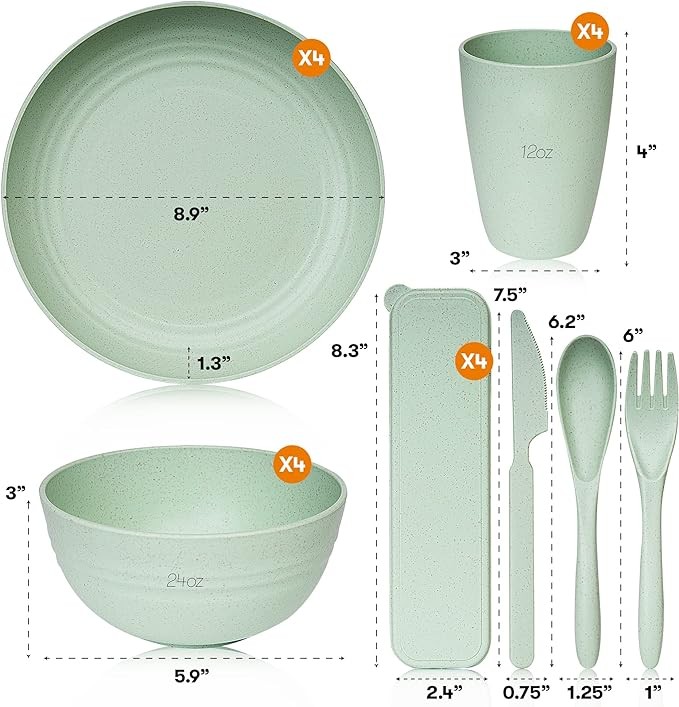 • Multipurpose Dinnerware - Our reusable dishes set for 8 are made for every occasion and will not only be great for home and kitchen use, but also convenient for an rv or camper, a picnic, BBQing, camping, work, school and much more. The unique design allows for easy compact storage as well. You can't go wrong with our wheatstraw dinnerware set.